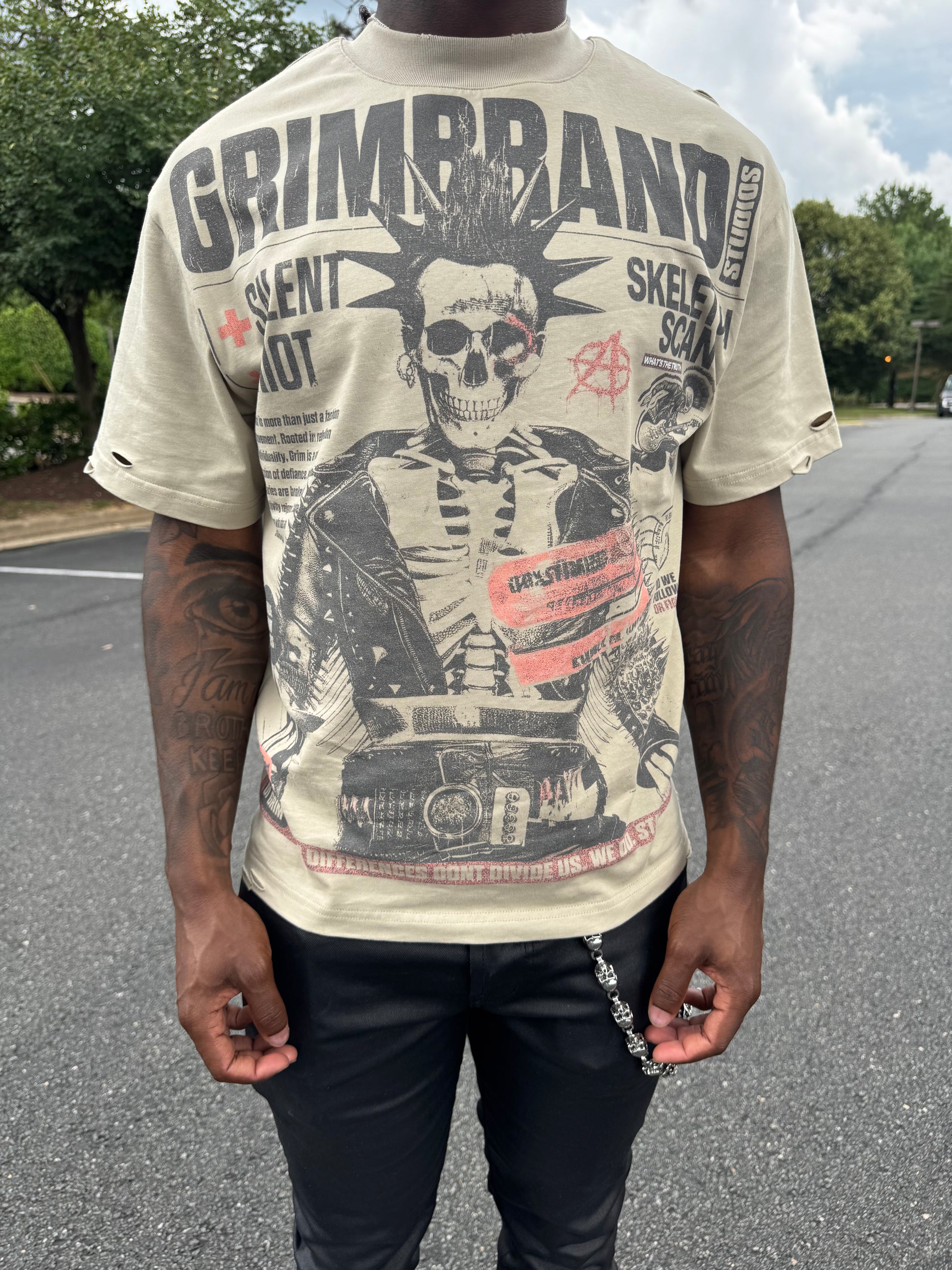 Stand out with the GrimBrand Punk Rock Tee, featuring a bold skeleton graphic and distressed details for an authentic punk vibe. Made from soft, durable cotton with a relaxed fit.